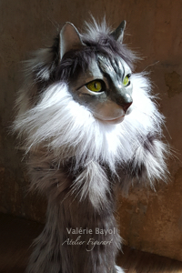 Balou, the main coon cat, 89 cm x 35 cm, Figur aus einer selbst hergestellten Holzmasse modelliert, Haare aus Kunstfell, der Kopf mit Acrylfarbe bemalt. Verkauft