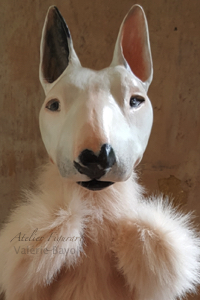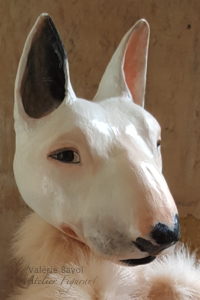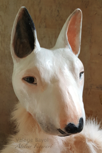 Tierportrait von Bulli Diego, Mini Bullterrier, als Handpuppe, etwa 85 cm x 25 cm.