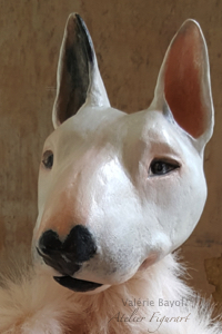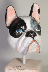 Der Kopf der Französischen Bulldogge ist aus einem sehr feinen Holzmaché modelliert und mit Acrylfarbe bemalt.