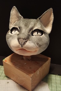 Tierportrait von Balou, dem Maine-Coon-Kater, 89 cm x 35 cm, als Handpuppe. Der Kopf ist aus einer selbst hergestellten Holzmasse modelliert, Haare aus Kunstfell, der Kopf mit Acrylfarbe bemalt. VerkauftWaldkauz, Greifvögel Rosalie, 89 x 35 cm, Der Kopf ist aus einer selbsthergestellten Holzmasse modelliert, Handpuppenkleid aus hochwertigem Kunstfell genäht, mit Acrylfarbe beemalt. Verkauft